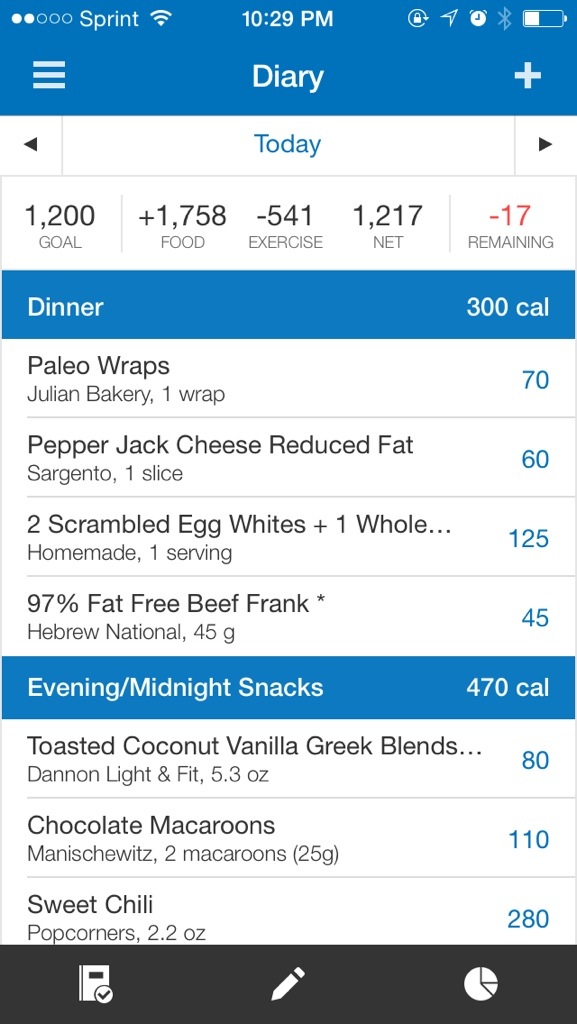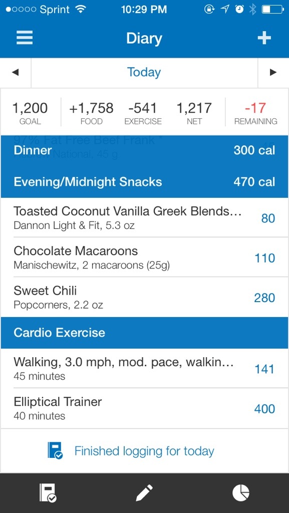 Lost control with my eating today. For some reason I was RAVENOUS this evening: I couldn’t stop snacking.