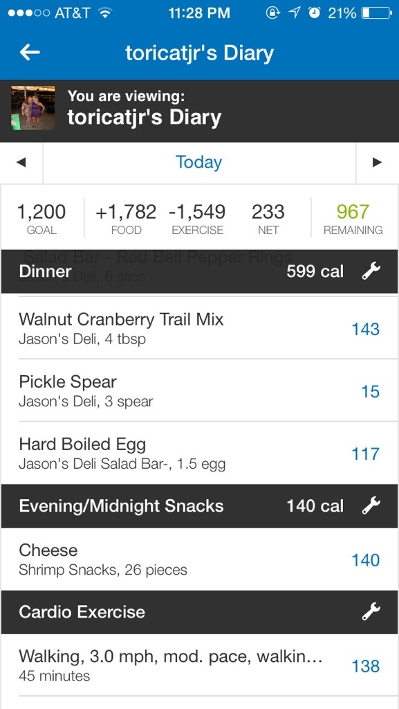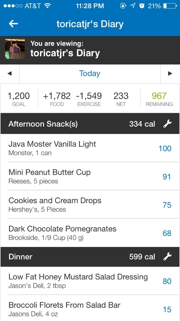I was good almost all day, except for my afternoon snack (a coworker walked around passing out bags of candy) and the dessert at dinner (how can you resist frozen yogurt?).