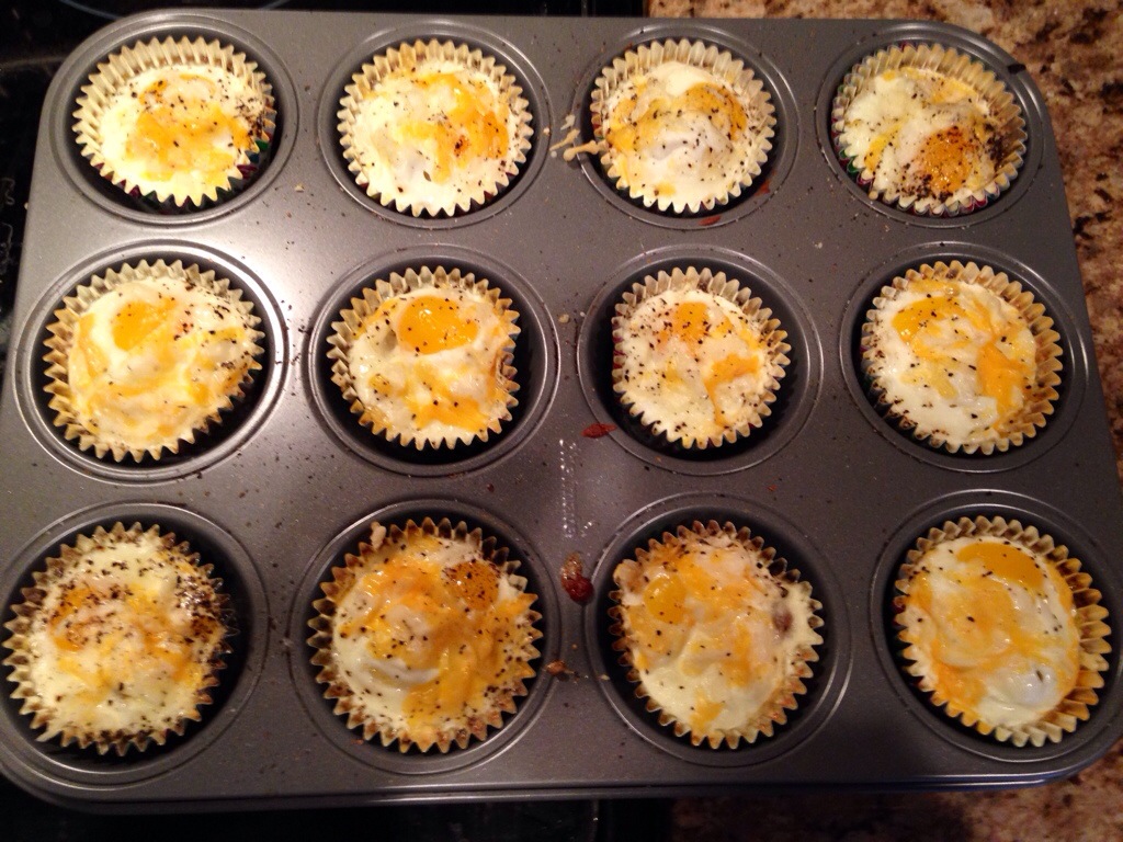 • If you’re using WHOLE eggs, crack a single egg into each cupcake liner. If you’re using the egg white/whole egg blend, fill the tin to 3/4 full.