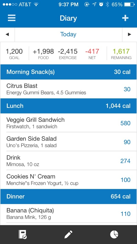 On Monday, I ate 1,209 calories (57g carbs, 64g fat, 89g protein) and on Tuesday I ate 1,370 calories (77g carbs, 74g fat, 99g protein). On Monday, I burned roughly 700 calories doing HIIT run/walk/jog intervals, and on Tuesday I went running with my neighbor and for a long walk after, burning a little more than a 1,000 calories.